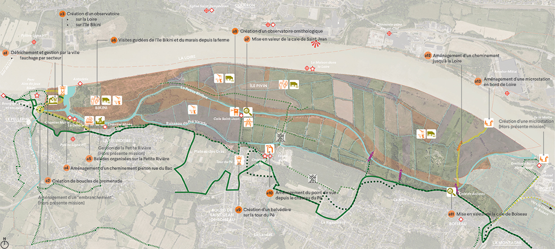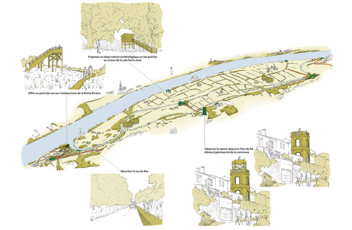 Le projet propose un parcours de découverte du lieu depuis l’extérieur en valorisant les différents points de vue existants : Tour du Pé, Château du Pé, embouchure de la Petite Rivière, Cale de Saint-Jean… Une incursion accessible à la saison estivale permettrait de rejoindre la Loire depuis le bourg. Se rattachant aux autres itinéraires présents, le parcours trouve une continuité avec les aménagements réalisés dans les communes voisines.